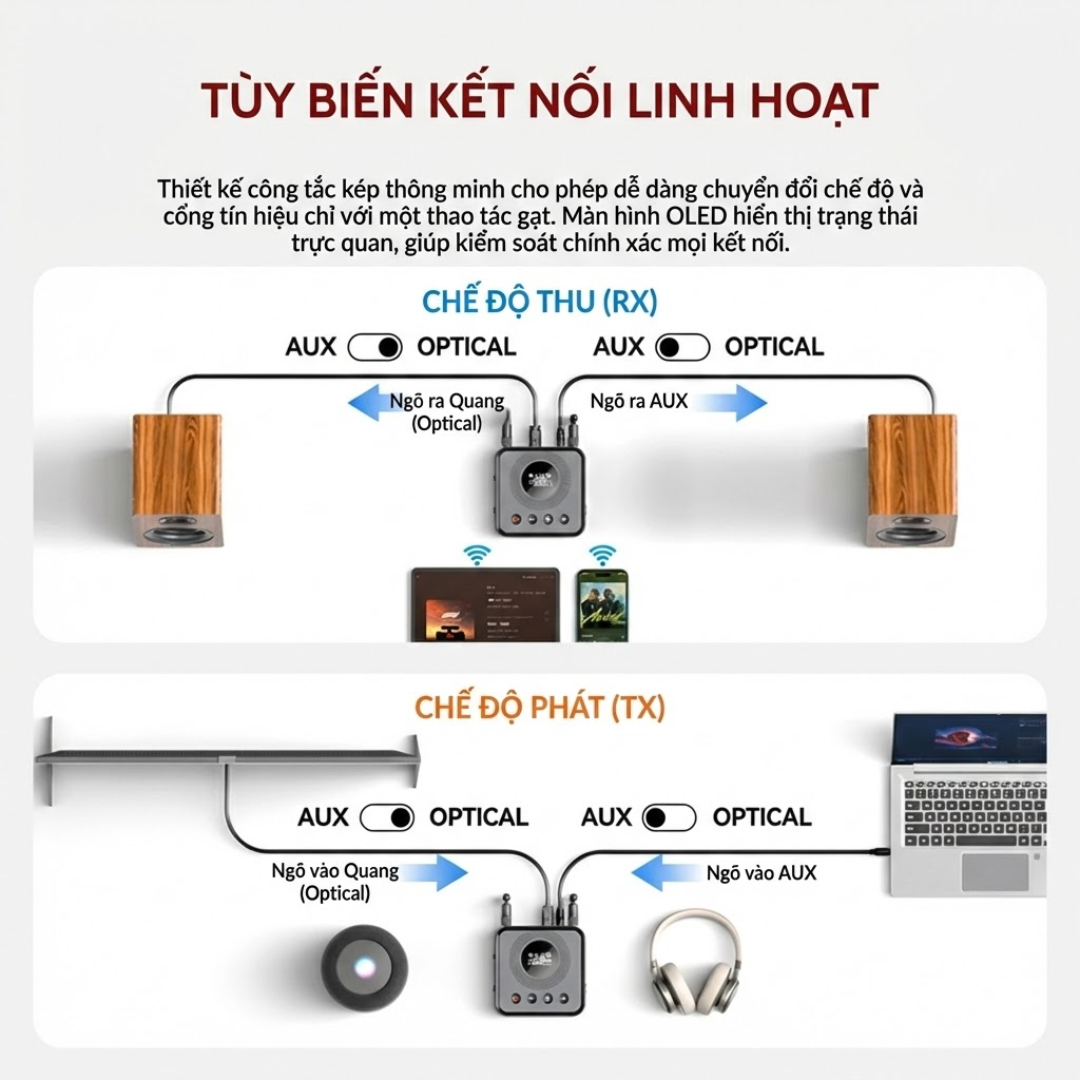 Thiết bị thu & phát âm thanh Bluetooth 2-trong-1 cao cấp, hỗ trợ RX (nhận) và TX (phát), tích hợp màn hình OLCD, chip Qualcomm kép + DSP, cho khả năng kết nối ổn định, độ trễ thấp và chất lượng âm thanh vượt trội.