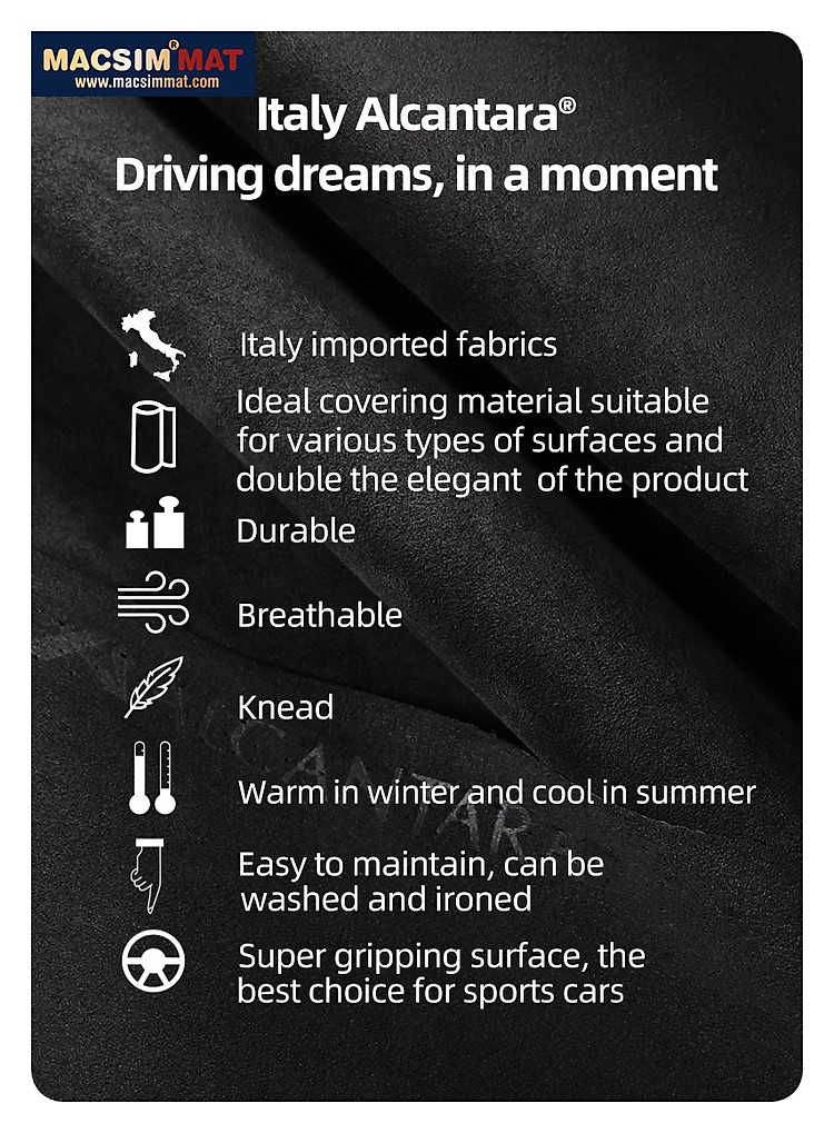 Nhận thấy những ưu điểm vượt trội của vật liệu Alcantara thương hiệu Macsim cùng với các nghệ nhân thiết kế sản xuất bọc vô lăng cao cấp bằng vật liệu Alcantara. Nguyên liệu nhập khẩu chính hãng từ Italia với lõi vô lăng làm bằng vật liệu silicon.