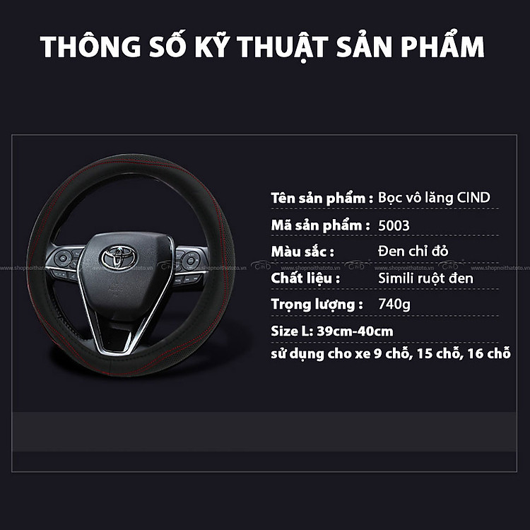- Bọc vô lăng CIND 5003 size L màu đen chỉ đỏ sử dụng những chất liệu cao cấp, mang đến sự dễ chịu nh ất đến người sử dụng. Sản phẩm tạo cảm giác mềm mại, dễ chịu không gây thô cứng, đau nhức tay hay gây trơn trượt mồ hôi khi lái xe trong thời gian dài. Kiểu dáng sang trọng sẽ mang đến cho không gian xe bạn một nét chấm phá mới, vừa nổi bật vừa đồng bộ cùng những phụ kiện khác.