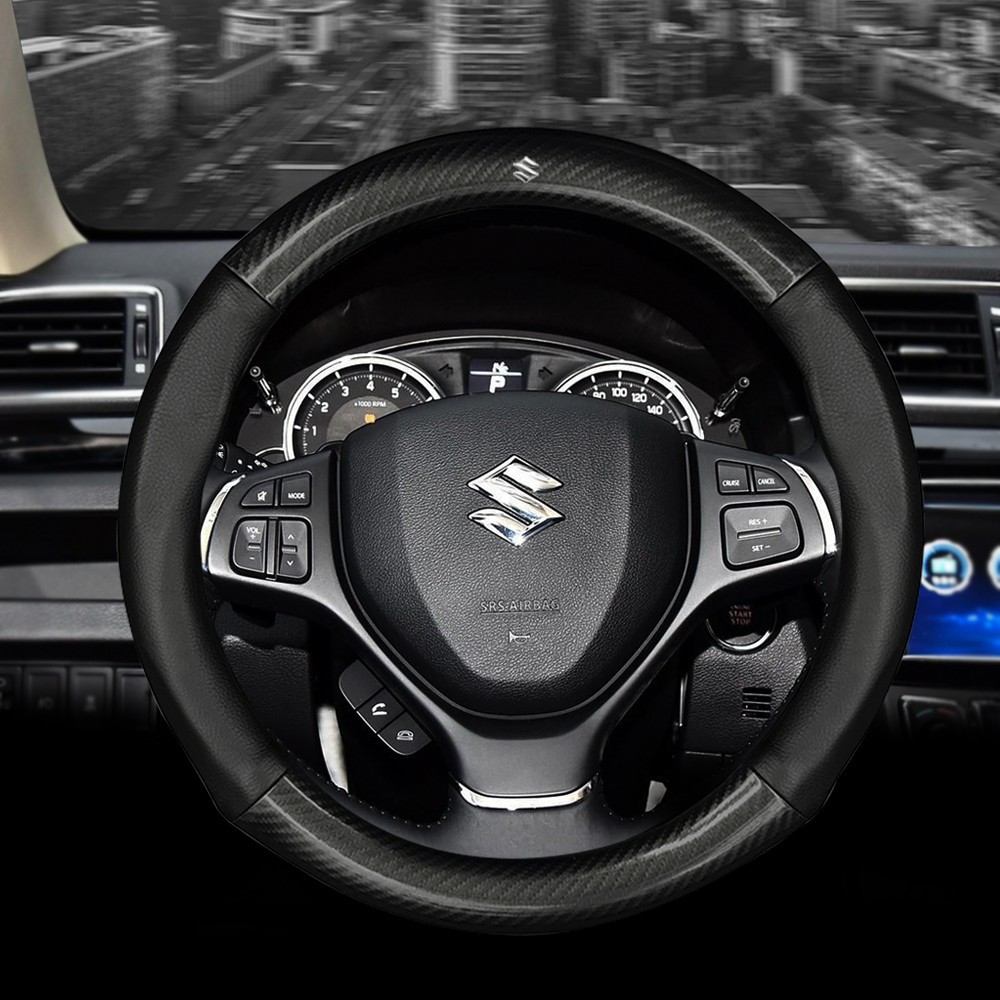 Bọc vô lăng TTAUTO cho xe ô tô có logo SUZUKI chất liệu da vân carbon cao cấp (Đen Nâu)