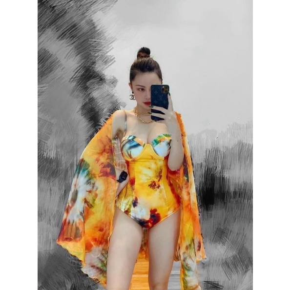 Bộ bơi áo tắm hoa vàng  liền thân kèm khăn choàng