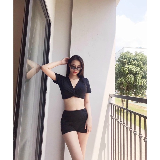 Bộ đồ bơi bikini nữ áo tay ngắn xoắn ngực quần đùi nhún cạp cao siêu tôn dáng