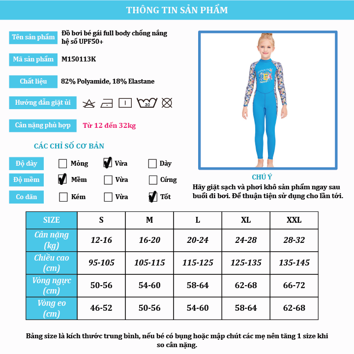 Chống nắng: Với chỉ số vải UPF 50+ đồ bơi toàn thân full body có khả năng chống nắng, chống tia cực tím có hại cho da, bảo vệ da bé khỏi ánh nắng mặt trời.
