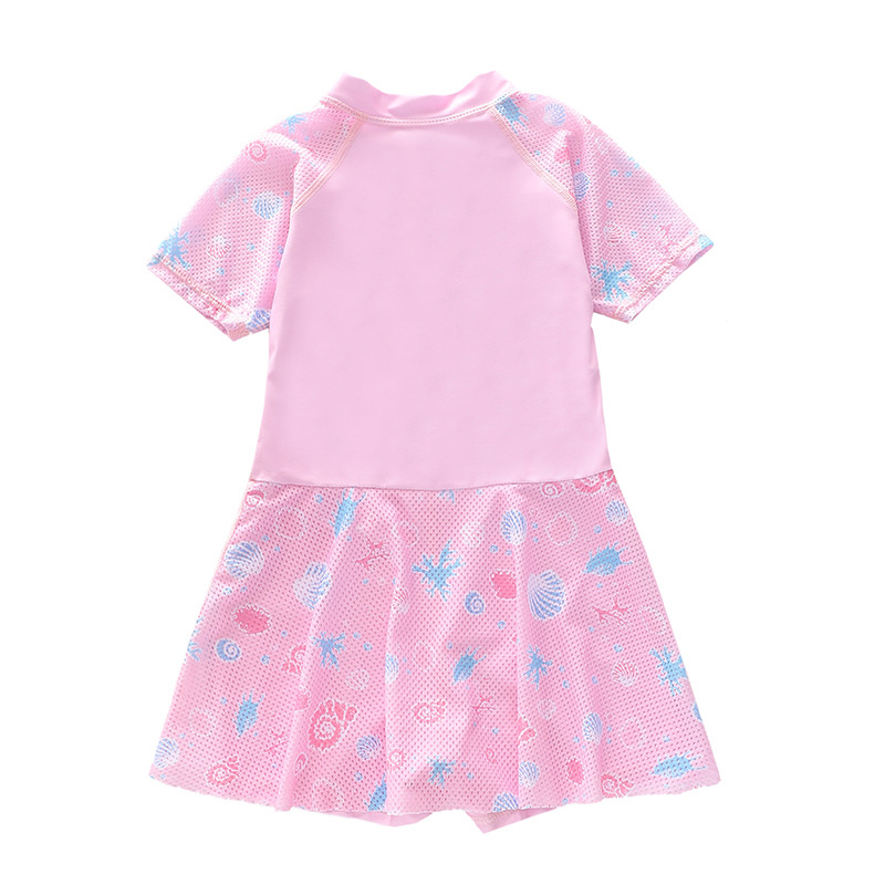 Đồ bơi bé gái thiết kế dáng váy phối hoạ tiết nàng tiên cá, áo tay ngắn zắc lăng vừa vặn vai bé giúp bé dễ dàng vận động cùng chân váy dáng xòe duyên dáng.