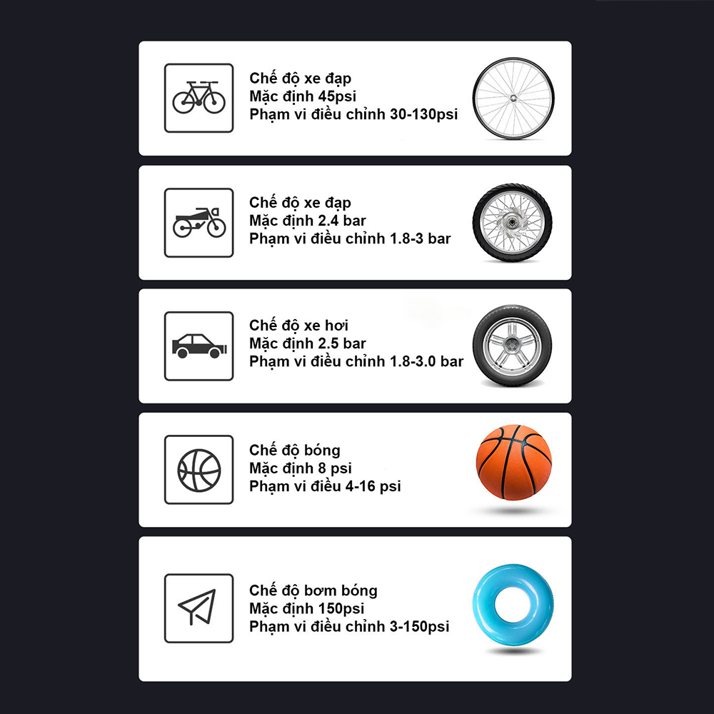 Để có thể bơm được cho nhiều vật dụng như bánh xe đạp, bánh xe máy, bánh xe hơi, bóng rổ, bơm phao,.... phù hợp với nhiều nhu cầu của người sử dụng, thiết bị được trang bị 5 chế độ bơm khác nhau với từng mức áp suất chuyên dụng. Người dùng có thể dễ dàng chuyển đổi giữa 5 chế độ giúp việc bơm hơi trở nên dễ dàng hơn.