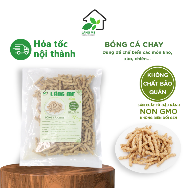 + Thực phẩm chay Làng Me làm từ 100% đậu nành, nước, lúa mì, tinh bột bắp,