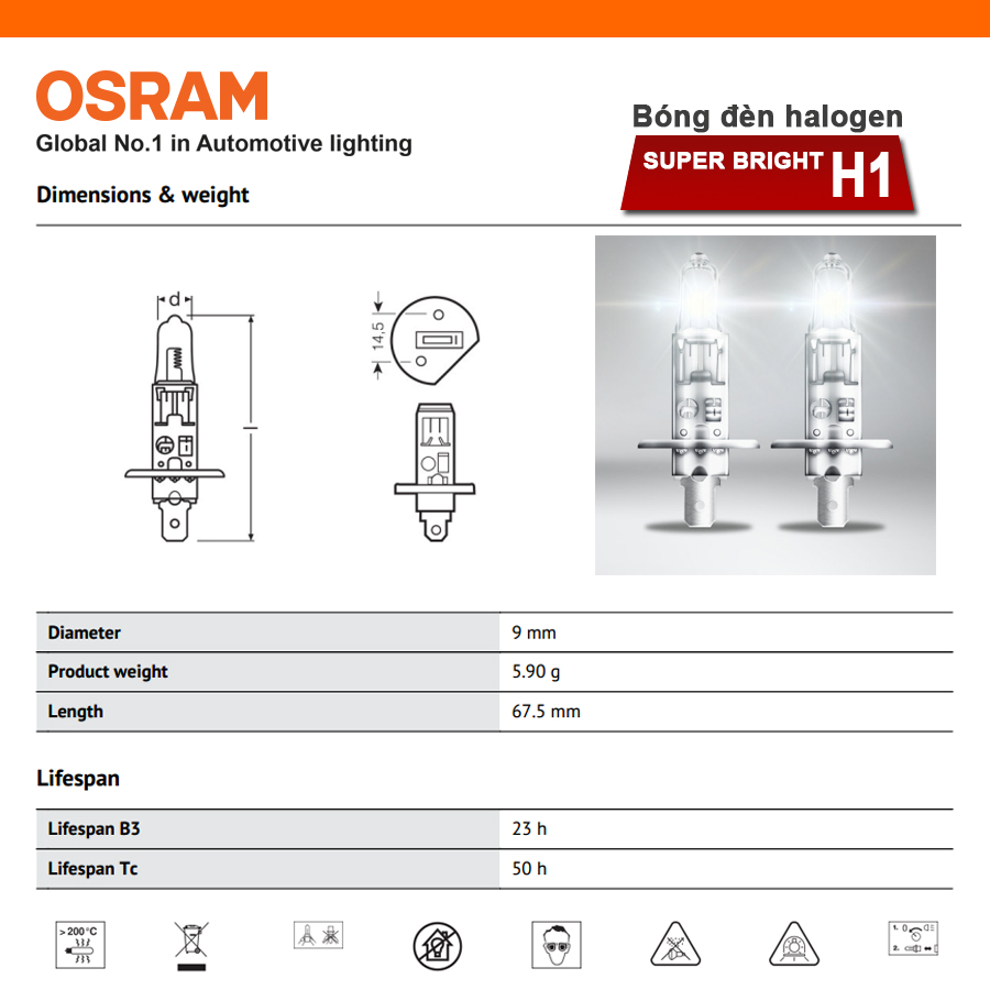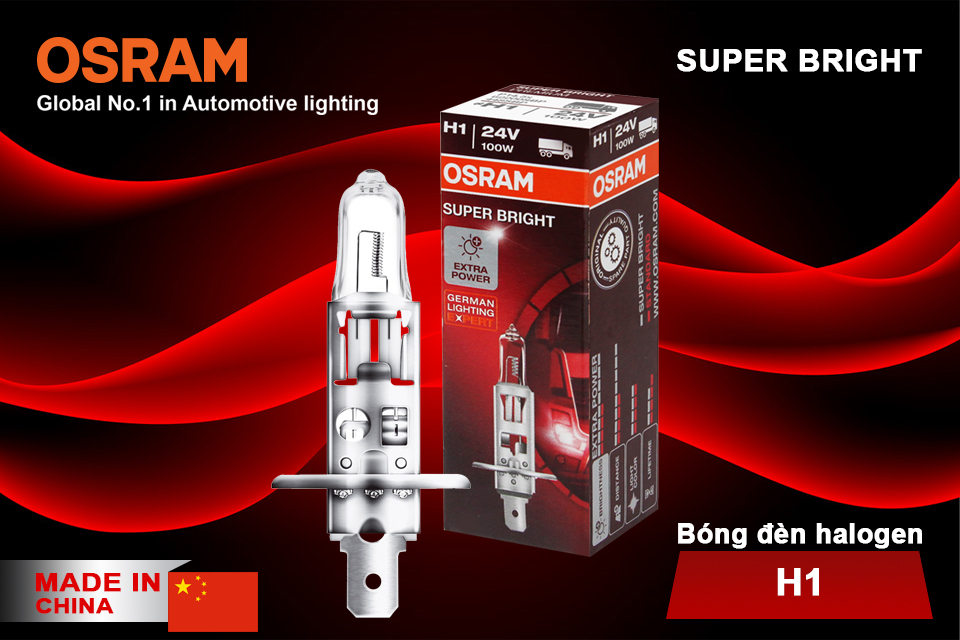- Bóng đèn halogen OSRAM SUPER BRIGHT H1 24v 100w được chế tạo bằng thủy tinh cao cấp đạt tuổi thọ sử dụng phù hợp giúp hỗ trợ chiếu sáng hiệu quả trên những chặng đường dài