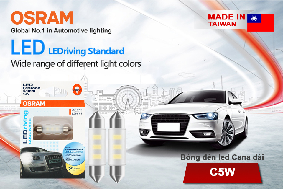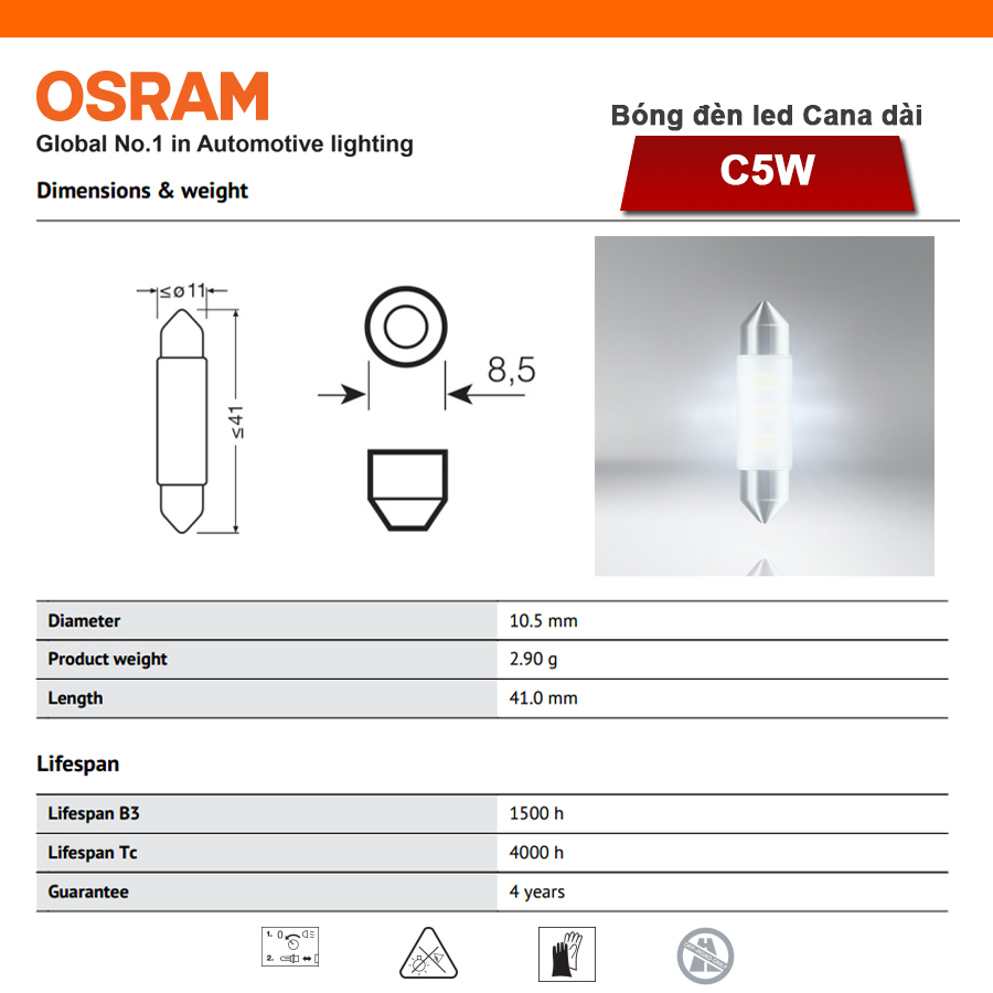- Bóng đèn led Cana dài OSRAM STANDARD RETROFIT C5W 12v màu trắng cool được chế tạo bằng chất liệu cao cấp đạt tuổi thọ sử dụng cao, hiệu quả chiếu sáng tốt cả nội thất lẫn ngoại thất ô tô.