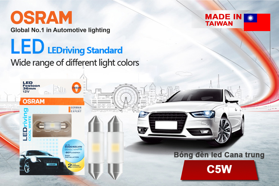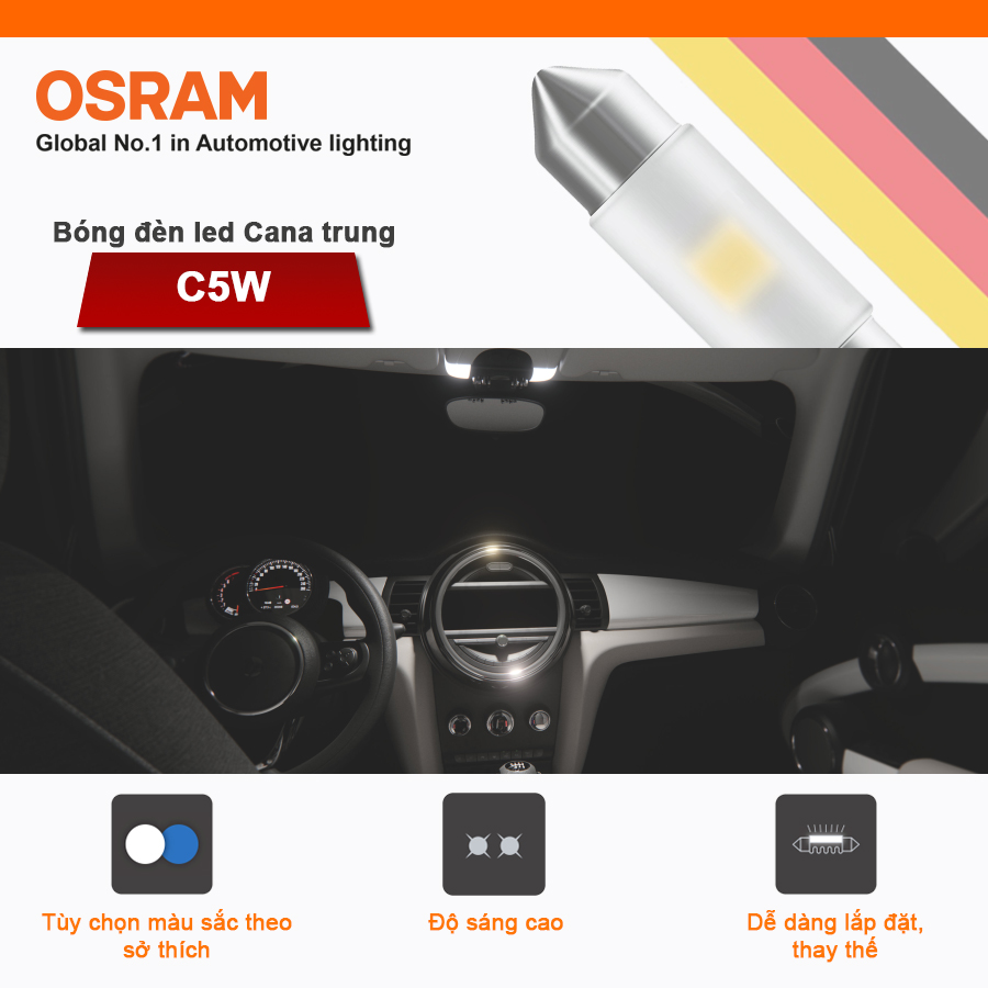 - Bóng đèn led Cana trung OSRAM STANDARD RETROFIT C5W 12v màu trắng cool được chế tạo bằng chất liệu cao cấp đạt tuổi thọ sử dụng cao, hiệu quả chiếu sáng tốt cả nội thất lẫn ngoại thất ô tô.