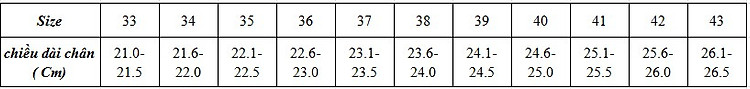 - Đặt chân lên tờ giấy trắng, lấy bút vạch 2 đầu, đo chiều dài giữa 2 đầu vạch và đối chiếu với bảng sau: