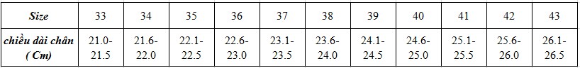 - Đặt chân lên tờ giấy trắng, lấy bút vạch 2 đầu, đo chiều dài giữa 2 đầu vạch và đối chiếu với bảng sau: