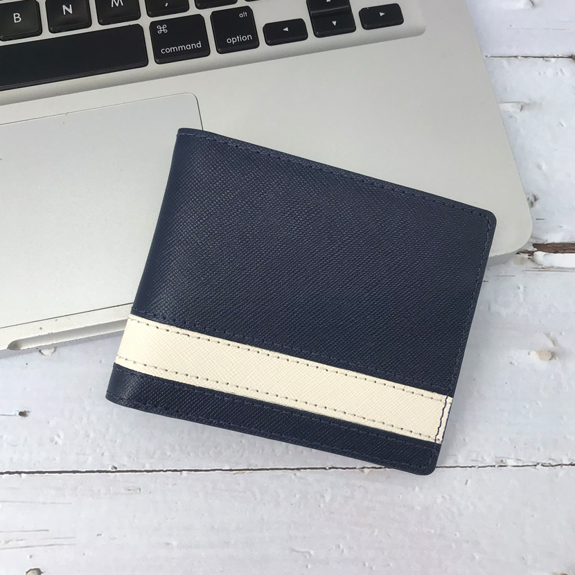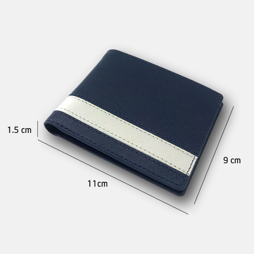 Mẫu ví Cosmos sử dụng chất da Saffiano nhập khẩu với hai phối màu trung tính là đen và xanh. Đường kẻ sọc trắng xám ngang ví là một điểm nhấn tinh tế mà ai cũng không thể rời mắt.