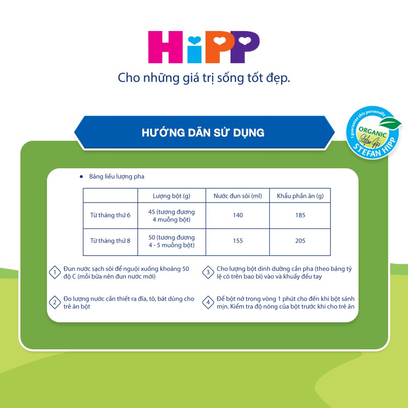 ✅ Bước 1: Đun nước sạch sôi để nguội khoảng 50 độ C (mỗi bữa nên đun nước mới) ✅ Bước 2: Đổ lượng nước cần thiết ra đĩa, tô, bát (chén) dùng cho bé ăn bột ✅ Bước 3: Cho lượng bột dinh dưỡng cần pha (theo bảng tỷ lệ có trên bao bì) vào và khuấy đều tay ✅ Bước 4: Để bột nở trong vòng 1 phút cho đến khi bột sánh mịn. Kiểm tra độ nóng trước khi cho trẻ ăn ____ HiPP là một trong những thương hiệu hàng đầu tại Đức, chuyên về các dòng thực phẩm dinh dưỡng hoàn toàn hữu cơ cho mẹ và bé. Chúng tôi thấu hiểu rằng trong giai đoạn đầu đời, các bậc phụ huynh luôn mong muốn đem đến cho con mình những nguồn dinh dưỡng tốt nhất cho sự phát triển khỏe mạnh của bé. Do đó, phương châm làm việc và niềm đam mê của Hipp luôn là mang đến những giá trị sống cũng như chất lượng sản phẩm tốt nhất cho người tiêu dùng. Không chỉ kiểm soát nghiêm ngặt trong quá trình sản xuất, mỗi sản phẩm của HiPP đều trải qua hơn 260 công đoạn kiểm tra gắt gao và hơn 1300 cuộc kiểm nghiệm kỹ càng, từ nguyên liệu đầu vào cho tới sản phẩm trước khi đưa đến tay người tiêu dùng.