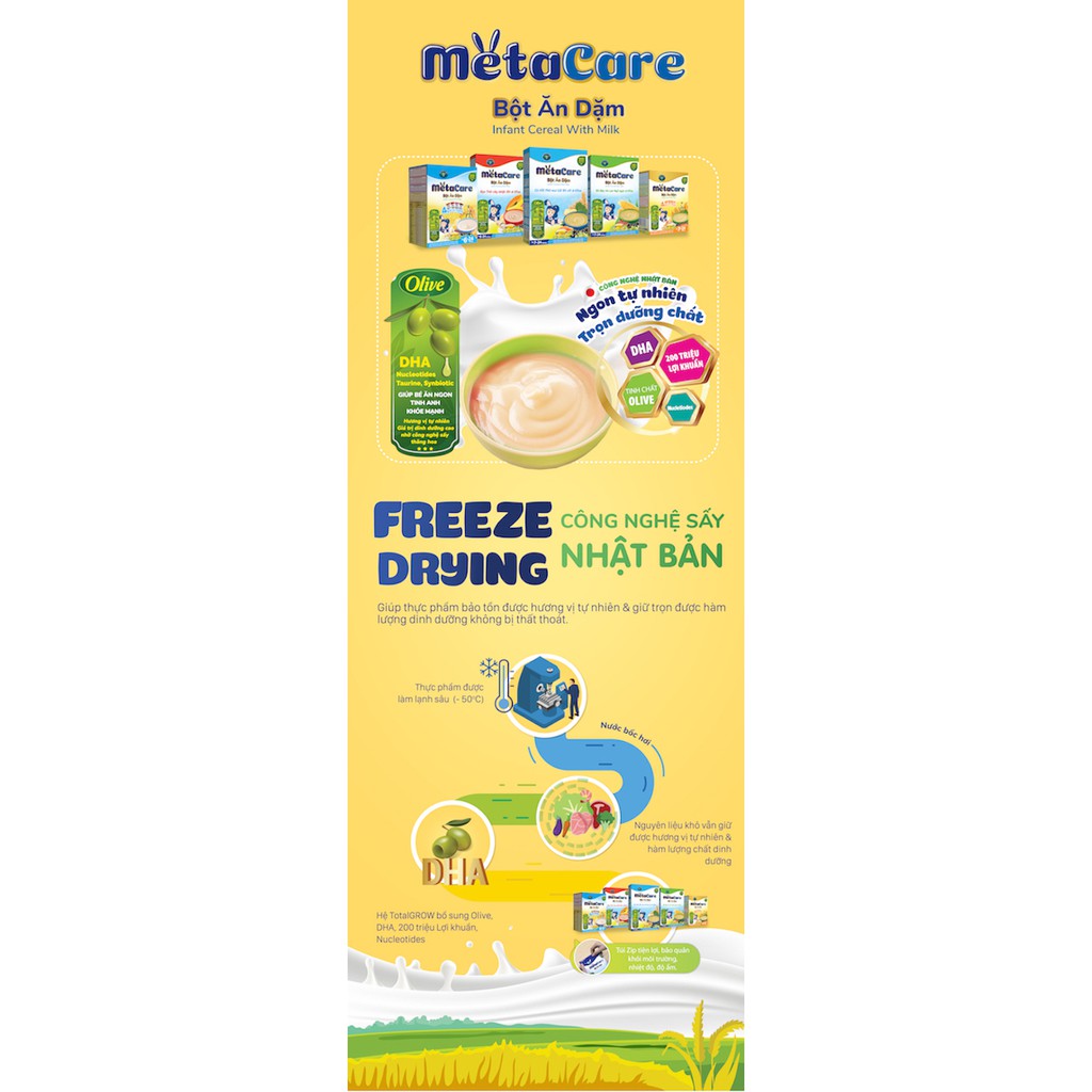 Bột ăn dặm Metacare - Dinh dưỡng hỗ trợ phát triển toàn diện giúp bé ăn ngon, tinh anh, khoẻ mạnh Bột ăn dặm Metacare là công thức chuyên biệt được nghiên cứu và xây dựng bởi các chuyên gia dinh dưỡng với 26 #vitamin và khoáng chất cùng các dưỡng chất đặc biệt như dầu #Olive, #DHA, kết hợp với các loại ngũ cốc có nguồn gốc #tự #nhiên, #không chất bảo quản, không màu nhân tạo an toàn cho bé. Dạng bột với công nghệ sấy thăng hoa giữ được toàn bộ chất dinh dưỡng và dễ khuấy, tiện lợi giúp mẹ tiết kiệm thời gian, an tâm chuẩn bị bữa ăn cho bé. 1. Đối tượng sử dụng: - Cho trẻ từ 7-24 tháng tuổi. 2. Đặc điểm nổi bật: - Hỗ trợ tiêu hoá: Tinh chất dầu Olive giúp nhuận tràng, tăng khả năng hấp thu đồng thời cung cấp chất béo tốt cho sự phát triển trí lực và thị lực. - Tăng cường miễn dịch: Vitamin A, C, E, Selen, Kẽm hàm lượng cao giúp tăng cường sức đề kháng tự nhiên, tăng cường miễn dịch cùng Nucleotides hỗ trợ miễn dịch đường ruột - Tăng cường thể chất: Công thức giàu đạm, năng lượng cùng các vitamin và khoáng chất như Canxi, Magiê, Vitamin D3 giúp bé phát triển chiều cao, lớn nhanh vượt trội. - Phát triển trí não: Tăng cường DHA, Taurine, Iốt, Folic Acid tốt cho não bộ, giúp bé tăng khả năng nhận thức và trí nhớ. 3. Giải thích về công nghệ sấy thăng hoa: Bột ăn dặm Meta Care sử dụng công nghệ sấy thăng hoa giúp bảo tồn giá trị dinh dưỡng và màu sắc hương vị của sản phẩm: – Thực phẩm tươi sống được lạnh đông nhanh sau đó đưa vào buồng hút chân không. – Khoảng 90% ẩm trong thực phẩm sẽ bốc hơi bằng cách thăng hoa nước đá ở nhiệt độ khoảng -50 độ C. – Thực phẩm sấy thăng hoa được đóng gói trong bao bì ngăn ẩm và oxy để giữ được phẩm chất cho đến khi được sử dụng. – Sau khi được chế biến với nước sản phẩm sẽ trở về trạng thái hương vị, hàm lượng dinh dưỡng, cấu trúc và hình dáng như ban đầu. *Túi Zip-lock tiện lợi cho sử dụng và tiết kiệm 4. Hướng dẫn sử dụng: Rửa sạch tay trước khi chuẩn bị bữa ăn cho trẻ. Đun nước sôi và để nguội dần đến nhiệt độ khoảng 50ºC. Rót nước vào tô, rắc từ từ từng muỗng bột ăn dặm. Khuấy đều cho đến khi bột mịn. Rửa sạch tay trước khi chuẩn bị bữa ăn cho trẻ. 5. Hạn sử dụng: 2 năm kể từ ngày sản xuất Xuất xứ: Việt Nam