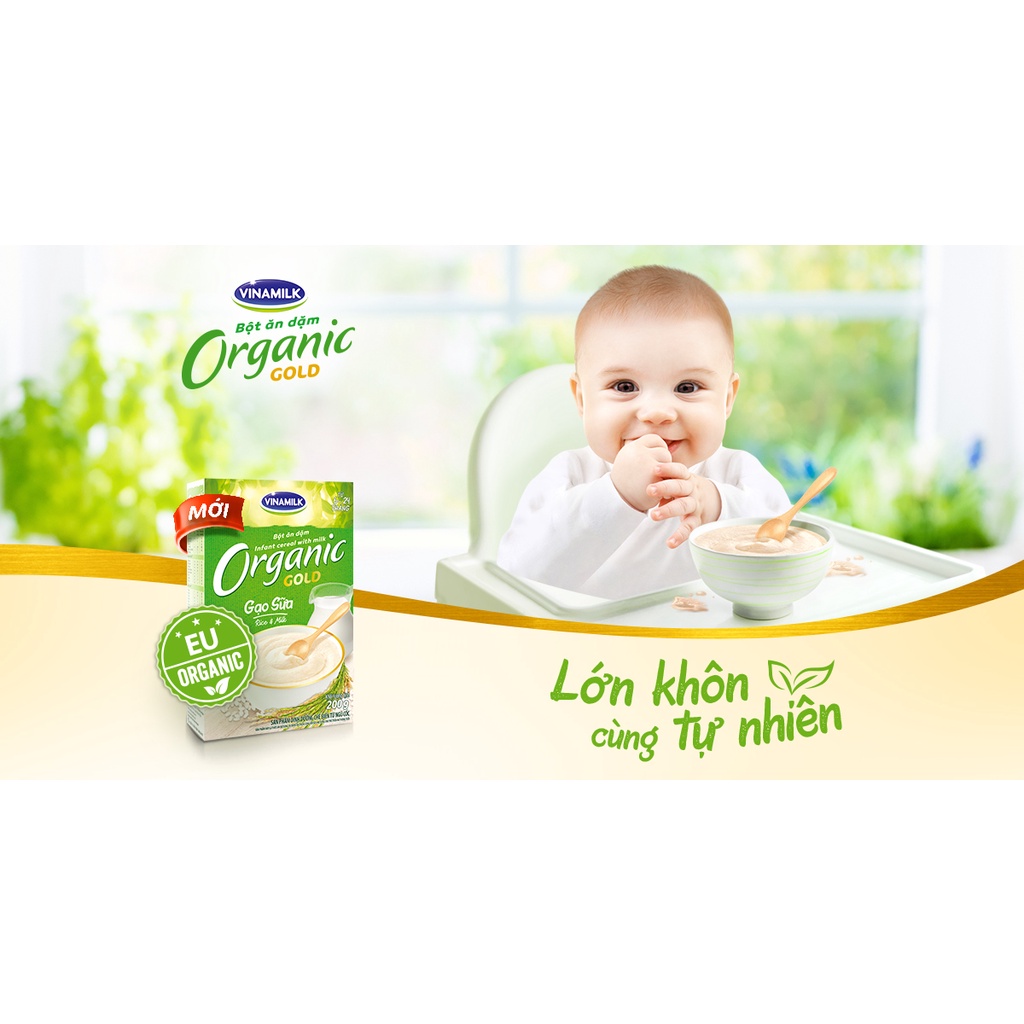Bột ăn dặm Vinamilk Organic Gold gạo sữa là sản phẩm mới nhất của Vinamilk được ra mắt cùng thời điểm với sữa bột công thức Vinamilk Organic Gold vào khoảng cuối tháng 6/2019 vừa qua. Trong thời gian đầu Vinamilk sẽ cho ra trước một vị truyền thống là vị gạo sữa, sau nếu được người tiêu dùng ủng hộ nhiều hơn sẽ cho ra thêm nhiều hương vị khác đa dạng nữa tương tự bột ăn dặm Vinamilk Ridielac.