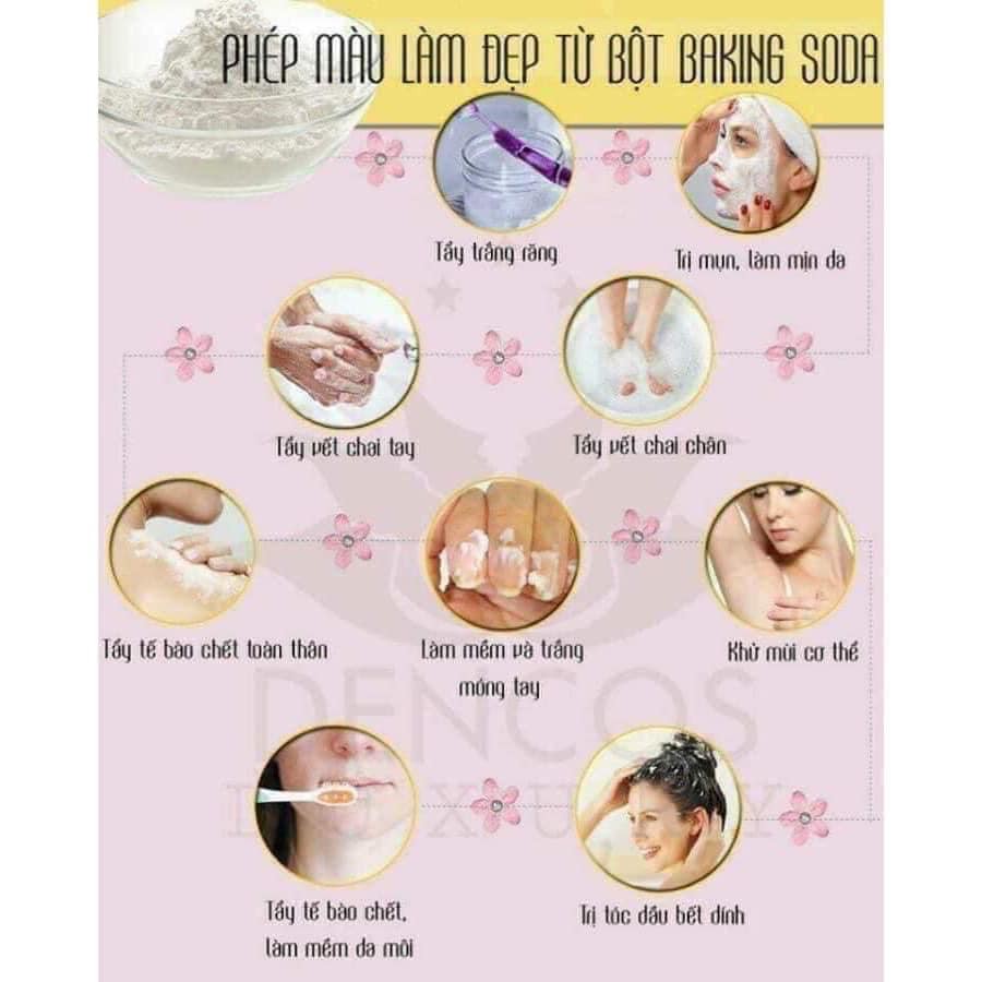 CÔNG DỤNG Bột Baking soda ngoài công dụng chính là thành phần làm bánh, bột Baking soda còn là thành phần không thể thiếu trong túi mỹ phẩm làm đẹp của bạn. Ngoài ra, Baking soda có nhiều tác dụng bất ngờ khác như: 1. Bột Baking soda làm trắng răng Bột Baking Soda có công dụng làm trắng răng. bằng cách bỏ một chút Baking soda lên kem đánh răng, dùng 1 tuần 2 lần. Bạn sẽ thấy hiệu quả rõ rệt sau một thời gian sử dụng 2. Bột Baking soda tẩy tế bào chết Pha hỗn hợp Baking soda với dầu thực vật theo tỉ lệ 1:1, sau đó thoa lên da và Massage nhẹ nhàng. Hỗn hợp này sẽ giúp tẩy tế bào chết , làm cho da được trắng sáng và tẩy sạch các bụi bẩn bám sâu vào da. Tẩy tế bào chết chỉ nên thực hiện tối đa 2 lần/tuần 3.Bột Baking soda khử mùi mồ hôi Để tạo nên một sản phẩm khử mùi mồ hôi, hãy trộn một ít gel lô hội aloe vera với Baking soda để trở thành hỗn hợp dùng để thoa 4. Bột Baking soda làm sạch móng tay, móng chân Cho một chút Baking soda vào nước ấm rồi bạn dùng bàn chải đánh răng chải nhẹ như đánh răng vậy. Bạn sẽ ngạc nhiên với hiệu quả mang lại chỉ sau lần sử dụng đầu tiên. Móng của bạn sẽ trở nên sáng và mịn hơn. 5. Bột Baking soda làm mềm mại chân Bạn cũng có thể bỏ một nắm tay Baking soda vào một chậu nước nóng để ngâm chân. Đôi chân của bạn sẽ trở nên mềm mại 6. Bột Baking soda làm sạch phụ kiện trang điểm Đổ một vài muỗng Baking soda vào một ly nước. Đợi nó tan trong nước một chút, sau đó bạn bỏ mấy cây cỏ trang điểm hay nhíp vào ly nước. Đó là một chất tẩy rửa rất tốt và nhẹ nhàng. Bạn có thể ngâm đồ nghề của mình trong ly nước qua đêm để làm sạch chúng - Trọng lượng: 454 gr - Xuất xứ: USA - Hạn sử dụng: 36 tháng