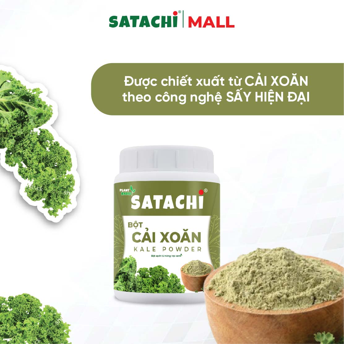 Bột Cải Xoăn Nguyên Chất SATACHI được sản xuất từ 100% cải xoăn tươi, áp dụng theo công nghệ sấy hiện đại và nghiền mịn, giúp giữ trọn hương vị, màu sắc và giá trị dinh dưỡng tự nhiên từ rau cải xoăn.