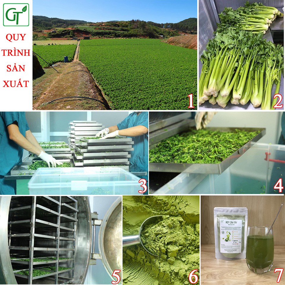Bột cần tây GT chiết xuất 100% từ những cây cần tây hữu cơ, sản xuất trong quy trình khép kín, công nghệ sấy lạnh FD từ Nhật Bản giúp giữ lại trọn vẹn dưỡng chất, màu sắc và vitamin từ những cây cần tươi. Sản phẩm hoàn toàn không sử dụng chất ổn định hay chất tạo màu.