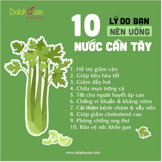 Thông tin sản phẩm: Bột Cần Tây Nguyên Chất 100% -- Giảm Cân Hiệu Quả - Làm Đẹp Da - Thanh Nhiệt - Giải Độc Bột Cần Tây có lợi ích gì? Cần tây có hàm lượng calo và tinh bột thấp, rất giàu vitamin và khoáng chất như Vitamin K, A, kali và folate (vitamin B9). Bột cần tây giúp phân huỷ chất béo , phục hồi hệ thần kinh trung ương, loại bỏ độc tố cũ và chất độc do đó hỗ giảm cân và tiêu hóa tốt. Cải thiện các vấn đề cân nặng, béo bụng và một làn da khỏe mạnh, tươi sáng Chỉ với 30s là bạn đã có ngay một ly nước cần tây tươi, ngon lành không cần lọ mọ dậy sớm để chuẩn bị nước ép hay rửa máy móc tốn thời gian.