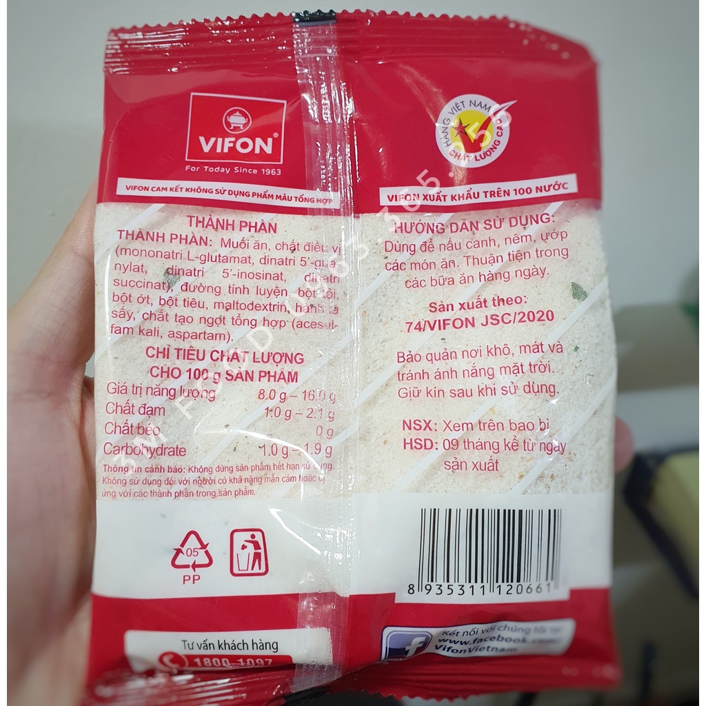 Muối bột canh, Bột canh Vifon chính hãng gói 200gr ( TẤT CẢ SẢN PHẨM có Hỗ trợ Hỏa Tốc tại Hà Nội ) ✔ Xuất xứ: Việt Nam ✔ Khối lượng: 200g ✔ Thành phần: Muối ăn, chất điều vị, bột ngọt, đường, bột tỏi, bột ớt, bột tiêu, hành lá sấy… ✔ Hướng dẫn sử dụng: Dùng để nấu canh, nêm, ướp các món ăn. Thuận tiện trong bữa ăn hàng ngày ✔ Hướng dẫn bảo quản: Bảo quản nơi khô, mát, tránh ánh nắng mặt trời ✔ Quy cách đóng gói: Gói