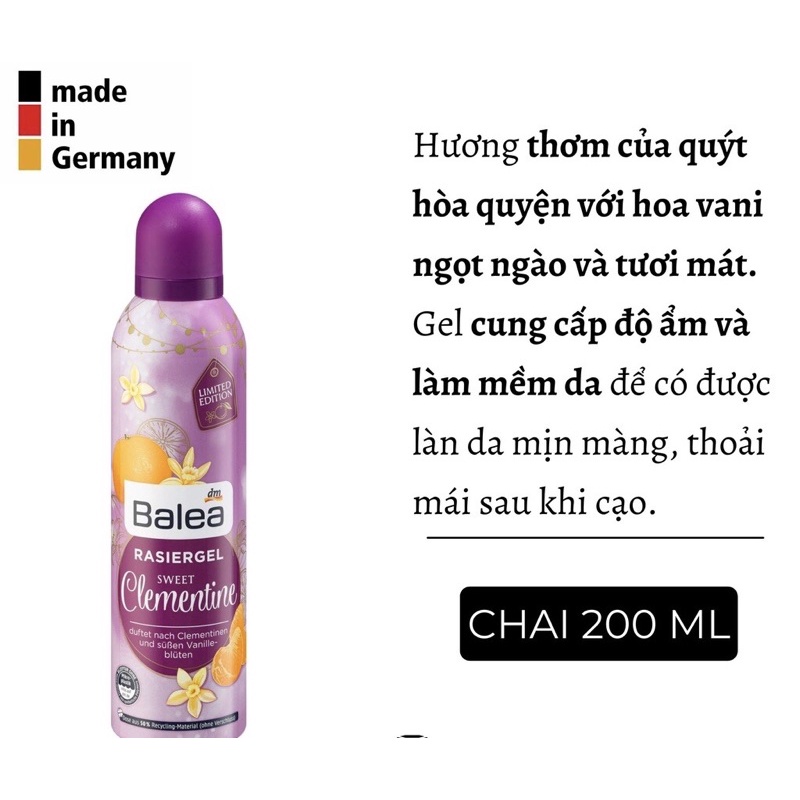 Dành cho cả da nhạy cảm nhất ⚡️ BỌT/ GEL CẠO LÔNG BALEA gồm 🌷 avocadool : protein tơ tằm và bơ: /bọt 150ml 🌸 Balea clementine : hương quýt + vani. /gel200ml ❤️ Balea rasier gel: nha đam + dầu bơ. /gel 200ml 🌷 lovely berries : hương dâu tổng hợp + hoa / bọt 150ml 🔴 HDSD: ➡️ Làm sạch và tẩy da chết vùng da cần cạo để có hiệu quả tốt nhất ➡️ Làm ẩm vùng da với nước ấm ➡️ Lắc đều lọ trước khi sử dụng (đối với dạng bọt cần giữ thẳng trước kho mở nắp) ➡️ Bôi bọt/gel lên vùng da cần cạo và cạo nhẹ nhàng với dao cạo sạch ➡️ Rửa lại vùng da vừa cạo với nước ‼️ LƯU Ý: - Bảo quản với nhiệt độ thông thường, tránh nhiệt độ cao trên 50 độ C (lọ có thể bị nổ/vỡ nếu chịu nhiệt quá nóng) - Không khoan/đốt ngay cả khi đã sử dụng hết - Không xịt vào mắt, vết thương hở hoặc làn da đang bị kích ứng - Tránh xa tầm tay trẻ em
