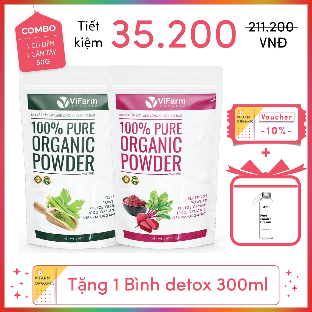• Công dụng: Sản phẩm được dùng thay thế cho củ dền tươi. • Hướng dẫn sử dụng: - Pha 1 muỗng cà phê (~2gram) với 100ml nước ấm và uống như nước trái cây/ rau củ. - Có thể cho vào làm nguyên liệu các món ăn như: bột ăn dặm, sữa chua, cháo, trộn cơm, chiên trứng,... hoặc ứng dụng công thức làm đẹp, nấu ăn, làm bánh, pha chế. • Thành phần: 100% củ dền nguyên chất; không hóa chất, hương liệu. • Bảo quản: Nơi khô ráo thoáng mát, tránh ánh sáng mặt trời, khóa chặt miệng bao sau khi sử dụng để ngăn bột tiếp xúc với ánh sáng. • Hạn sử dụng: 12 Tháng • Thương hiệu ViFarm, sản xuất tại Việt Nam.
