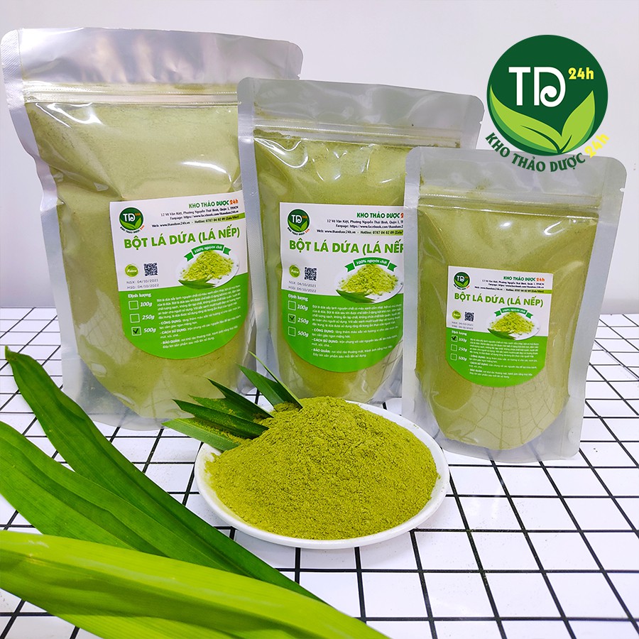 Bột lá dứa (lá nếp) nguyên chất 100%, tạo màu và mùi thơm cho các món xôi lá nếp, mứt dừa, thạch rau câu, các loại bánh