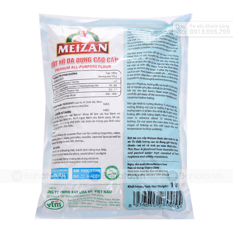 Loại bột: Bột mì đa dụng cao cấp Khối lượng: 1kg Thành phần: Lúa mì, vi chất sắt, kẽm Công dụng: Dùng để làm bánh mì, bánh bông lan, bánh ngọt, bánh rán, bánh pizza, mì sợi, bánh bao hoặc dùng làm các món chiên giòn, tẩm bột Cách dùng: Lượng dùng tuỳ thuộc vào mục đích sử dụng Bảo quản: Để nơi khô ráo, thoáng mát, tránh ánh nắng trực tiếp Thương hiệu: Meizan (Việt Nam)