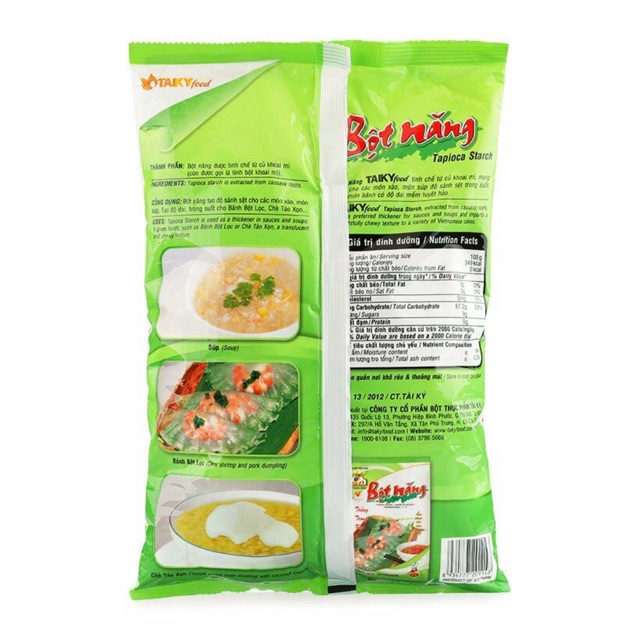 Xuất xứ Việt Nam Khối lượng 400g Thành phần Tinh bột khoai mì 100% Hạn sử dụng 12 tháng kể từ ngày sản xuất Hướng dẫn sử dụng Dùng cho món xào, món chè, món súp: Hòa 1 lượng bột năng vừa đủ với nước và khuấy đều. Khi món ăn chín, vừa đổ hỗn hợp bột năng vào món ăn vừa khuấy đều tay để bột năng không bị vón cục. Đun món ăn thêm 2 phút thì tắt bếp Hướng dẫn bảo quản Bảo quản nơi khô ráo, thoáng mát, tránh ánh nắng trực tiếp Quy cách đóng gói Gói