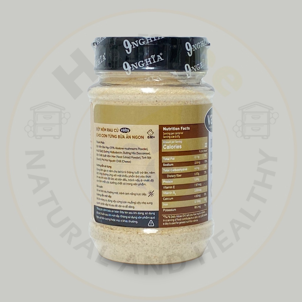 Bột nêm Nấm Bào Ngư & Phô Mai dành cho bé ăn dặm VABY hủ 90g - Gia vị nêm và rắc dành cho bé từ 6 tháng tuổi | NÔNG TRẠI HOMEE ---------- Bột nêm nấm bào ngư cho bé VABY được làm chủ yếu từ nấm bào ngư làm cho món ăn thơm ngon bổ dưỡng, rất tốt cho hệ tiêu hóa, gan, thận và hệ tim mạch.