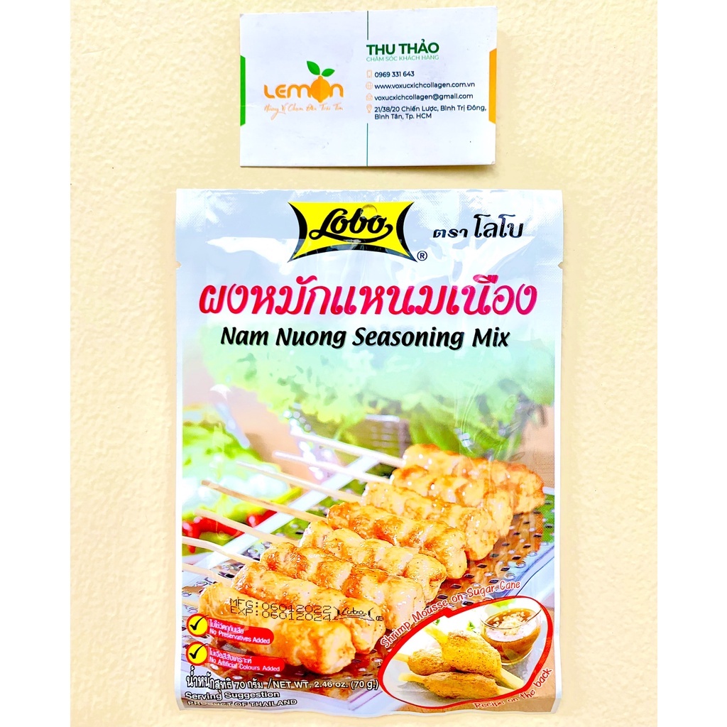 BỘT GIA VỊ NEM NƯỚNG LOBO THÁI LAN (gói 70g) Thành phần: Gluten lúa mì 35.5%, đường 21.5%, gạo nếp rang 15%, chất điều vị 7%(E621), chất điều chỉnh độ acid 10%, E331(i), E500(ii), E451(i), muối, đạm đậu nành thủy phân, gia vị (tỏi, hạt tiêu, nghệ), chất ổn định (E407) Khối lượng: 70g HSD: 2 năm ----------- Cách làm nem nướng Nguyên liệu: - 500gr thịt nạt heo xay hoặc tôm xay (tôm lột vỏ, để thật ráo, cho vào ngăn đá (30p) xay nhuyễn, quết lại cho thật dai) - 1 gói gia vị làm nem nướng Thái Lan - Que xiên thịt Cách làm: Lấy gói gia vị này quết chung với thịt hoặc tôm, nắn theo ý thích vào xiên rồi nướng. Trong quá trình nướng nếu thấy thịt hoặc tôm bị khô có thể phết một ít dầu lên thịt đang nướng. Lưu ý làm món chạo tôm thì sau khi nắn viên xong hấp trước khi chiên nhé.