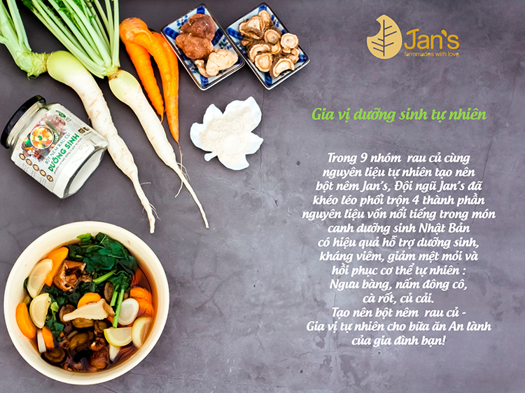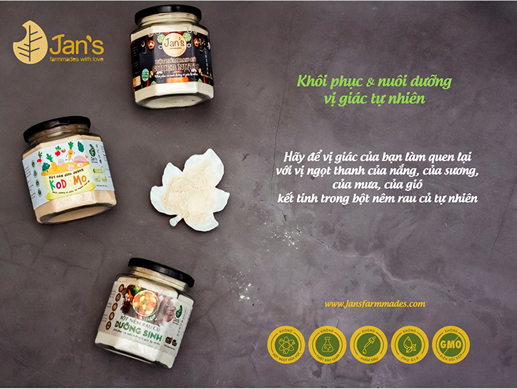 Cũng như các sản phẩm khác của Jan’s, bột nêm rau củ dưỡng sinh đảm bảo tiêu chuẩn 5 không: