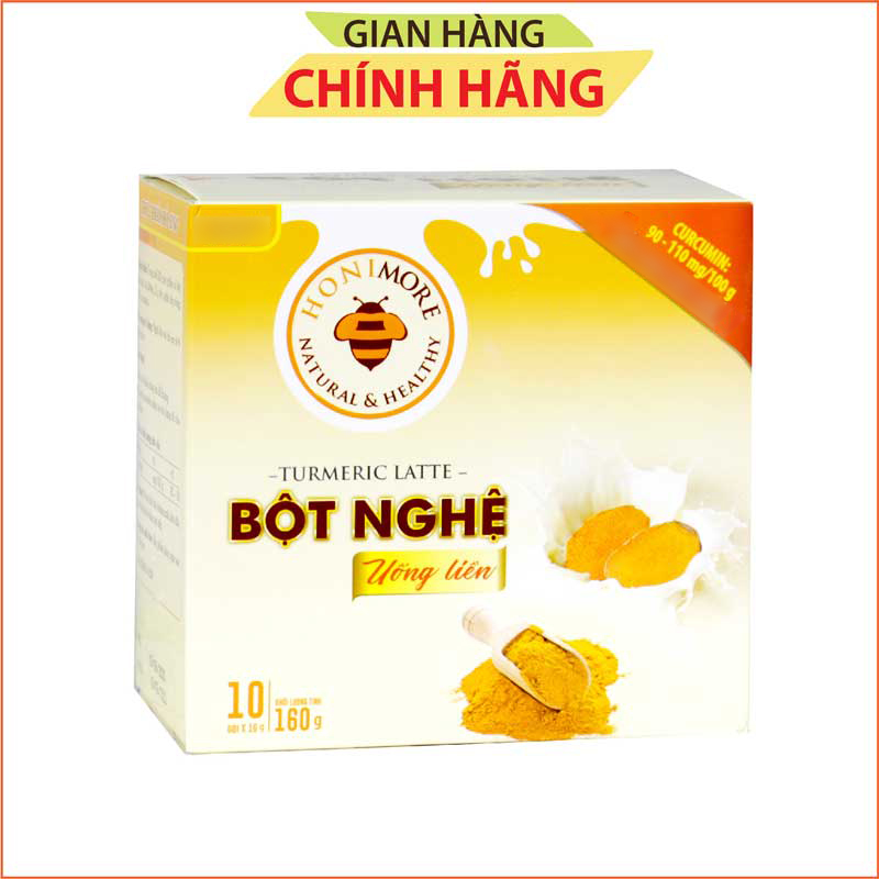 - Bột nghệ uống liền Honimore có công thức thơm ngon, kết hợp giữa bột kem thực vật chiết xuất từ trái cọ và nghệ vàng nguyên chất.