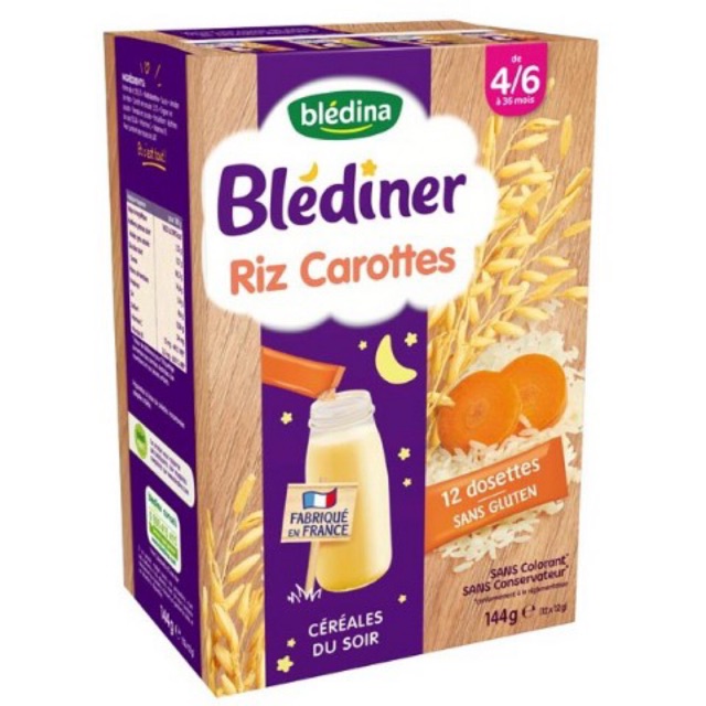 Bột pha sữa là sản phẩm đang ngày càng được các mẹ yêu thích bởi nó giúp cho hương vị của sữa mới lạ hơn, hấp dẫn hơn và đặc biệt là cung cấp nguồn dưỡng chất khổng lồ, đáp ứng nhu cầu của cơ thể bé. Đối với các bé trong độ tuổi ăn dặm thì việc bé hay thức giấc giữa đêm vì đói là điều thường xuyên xảy ra. Do đó, bột pha sữa là sản phẩm hoàn hảo giúp bé no bụng và ngủ thẳng giấc tới sáng. Bột pha sữa Blediner dành cho bé từ 6-36 tháng tuổi. Thành phần giàu dưỡng chất, hương vị dịu nhẹ và dễ chịu từ gạo - cà rốt giúp bé thích thú hơn khi uống sữa được pha với bột. Bột pha sữa Bledina cung cấp nguồn dưỡng chất với các loại Vitamin và khoáng chất như: Canxi, Sắt, Kẽm... Vitamin A, D, E, B1, B2, B6, B12, C, Phốt pho... Bột pha vào sữa sẽ tạo nên hỗn hợp sệt sệt khiến bé thích thú hơn khi uống. Cũng nhờ đó giúp kích thích phản xạ nhai - nuốt cũng như khả năng dẻo dai và linh hoạt của cơ hàm. Công dụng - Sản phẩm giúp bổ sung thêm chất xơ, - Hỗ trợ tăng cường hấp thu. - Cải thiện hệ tiêu hoá, chống táo bón hiệu quả. - Cung cấp đủ các khoáng chất và các vitamin cần thiết cho sự phát triển của trẻ. Sản phẩm hoàn không sử dụng phẩm màu, không chất bảo quản. Gợi ý lượng pha - 6-8 tháng: 3 muỗng (~4g/muỗng) pha với 210ml sữa. - 9-12 tháng: 4 muỗng (~4g/muỗng) pha với 240ml sữa. - 12 tháng trở lên: 5 muỗng (~4g/muỗng) pha với 250ml sữa