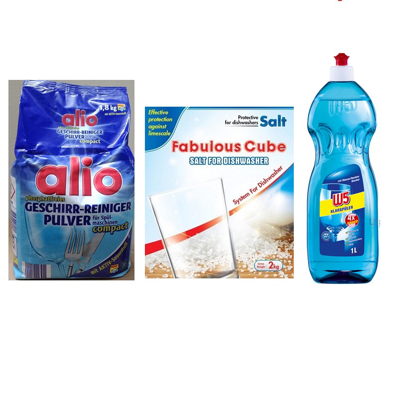 Bột rửa chén bát Alio 1.8kg+muối làm mềm nước chuyên dụng 2kg+bóng Alio 1000 ml