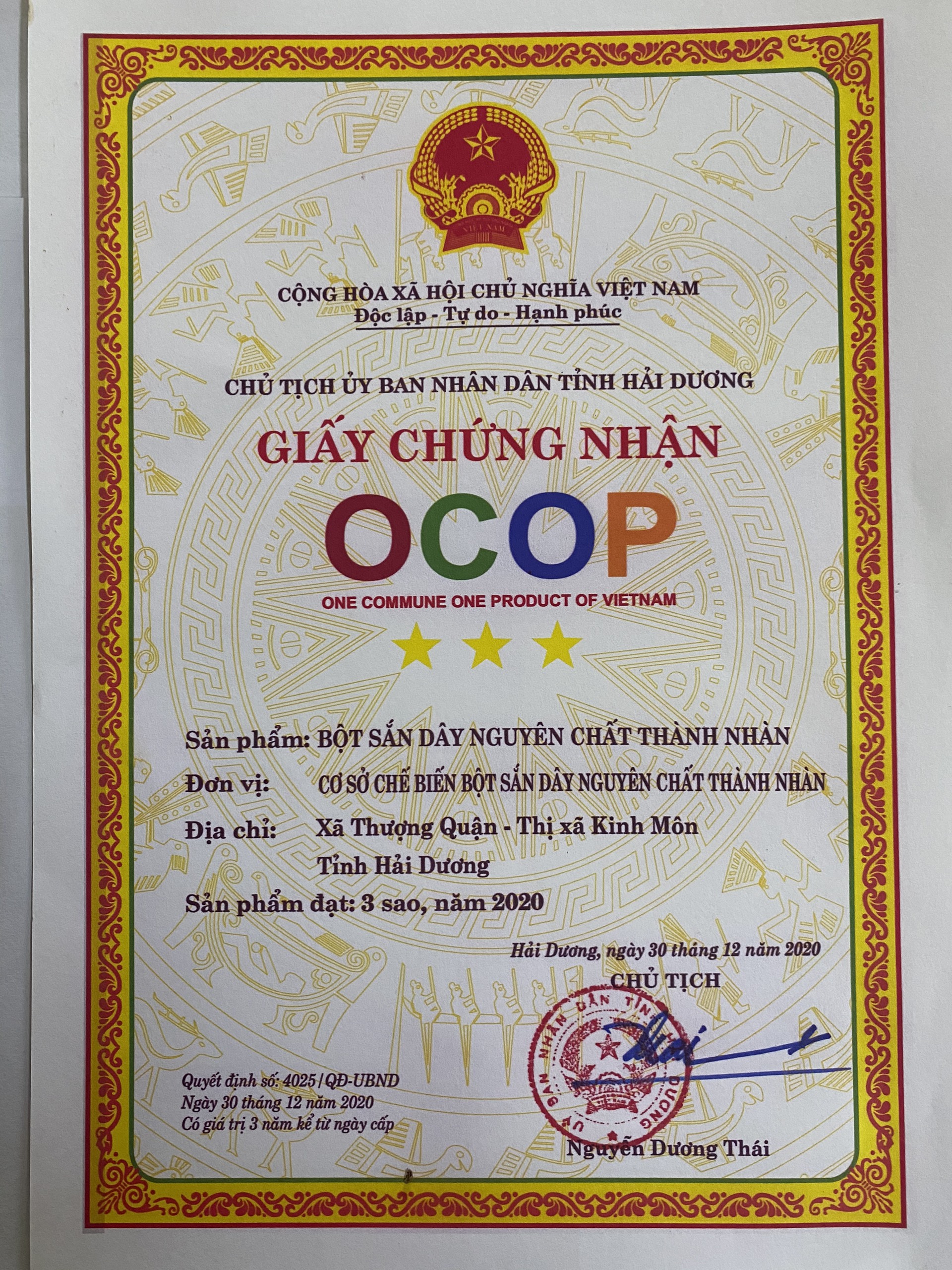 Bột sắn dây nguyên chất Thành Nhàn được sản xuất 100% từ nguyên liệu tự nhiên là sắn dây ta được trồng tại xã Thượng Quận – Kinh Môn – Hải Dương. Với nguồn nguyên liệu sạch và quy trình chế biến tuân thủ các quy định an toàn thực phẩm khắt khe nhất cho ra sản phẩm bột sắn dây chất lượng nhất đảm bảo yêu cầu về an toàn thực phẩm và được cấp giấy chứng nhận an toàn thực phẩm, sản phẩm ocop 3 sao cấp tỉnh, chứng nhận chất lượng HACCP