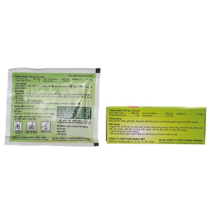 Thành phần Mỗi gói 7g chứa: Kim ngân hoa 300 mg, Cúc hoa trắng 300 mg, Vitamin C 75 mg, Chiết xuất chanh 1000 mg