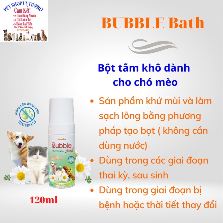 - BUBBLE BATH là sản phẩm khử mùi và làm sạch lông bằng phương pháp tắm khô mà không cần dùng nước.Với chiết xuất từ thiên nhiên có hương thơm nhẹ nhàng, kháng khuẩn tự nhiên để bảo vệ làn da của thú cưng khỏi sự tấn công của vi khuẩn và nấm. Được bổ sung chiết xuất tơ tằm cùng với Pro vitamin B5, phục hồi thương tổn và tái tạo lại sợi lông giúp cho bộ lông được mượt mà, sáng bóng, mang lại cảm giác dịu mát trên làn da của thú cưng.