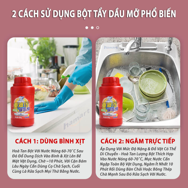 - Với các vết bẩn dầu mỡ nhẹ, bột tẩy có thể được hoà tan & dùng bình xịt hiệu quả nhanh chóng