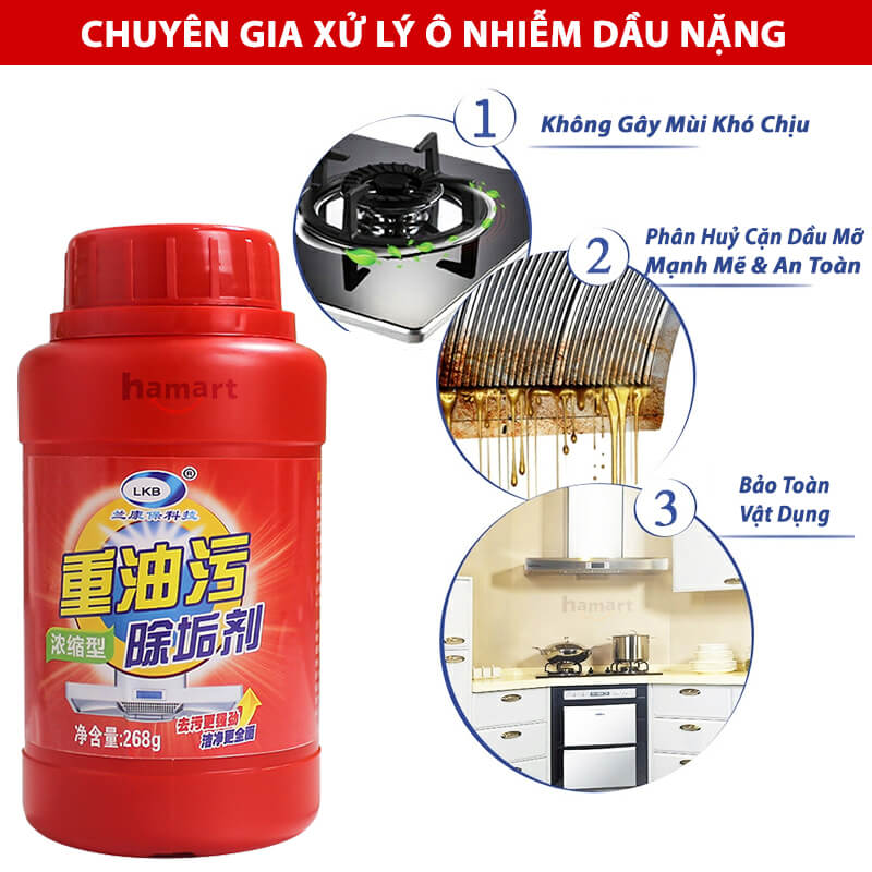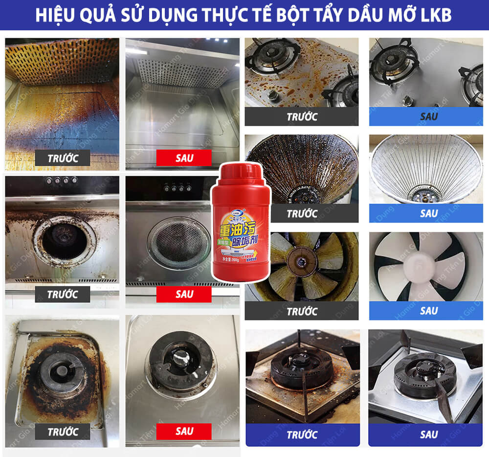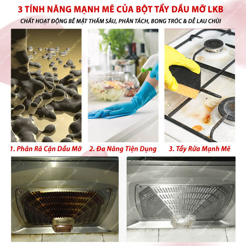 ️ Các vết dầu mỡ tích tụ lâu ngày sẽ tạo thành cặn bẩn bám trong nhà bếp hay vật dụng nấu bếp, gây ra ô nhiễm dầu mỡ, thúc đẩy vi khuẩn gây hại sinh sôi, vật dụng nấu bếp hỏng mòn nhanh, gây mùi hôi khó chịu Thật phiền não & ảnh hưởng tới sức khoẻ của chủ nhân bếp cũng như các thành viên trong gia đình - Bột chuyên dụng tẩy cặn dầu mỡ LKB chính là giải pháp làm sạch ô nhiễm dầu mỡ nhà bếp mức độ từ nhẹ tới nặng, hiệu quả & tiện lợi, mang tới căn bếp sự sạch sẽ, tươi mới tràn đầy hứng khởi