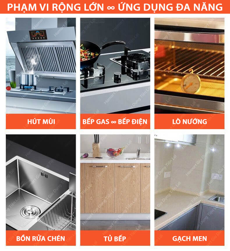 - Làm sạch nhiều vật dụng thường xuyên bị bẩn dầu mỡ như xoong nồi, bếp gas, lò nướng, hút mùi, chậu rửa