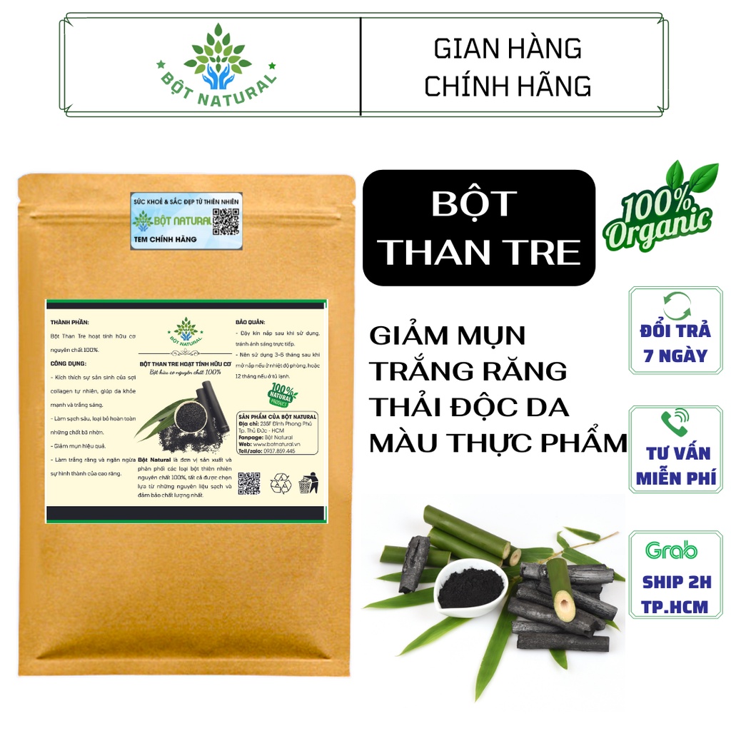 BỘT THAN TRE HOẠT TÍNH Thành phần: BỘT THAN TRE HOẠT TÍNH nguyên chất 100%, cam kết không pha trộn, không chất bảo quản và đặc biệt thân than tre được tuyển chọn và nung ở 800 đến 1000 độ C. Bột Than Tre Hoạt Tính có tác dụng vô cùng tuyệt vời trong việc thải độc, loại bỏ bã nhờn, giảm nám và được xem như một vị cứu tinh cho làn da của chị em phụ nữ. Là sản phẩm lành tính giúp làn da luôn tươi trẻ, mịn màng và căng tràn sức sống. Công dụng: - Giúp da thải độc tố và hút sạch các chất cặn bẩn nằm sâu trong lỗ chân lông. - Kích thích sự sản sinh của sợi collagen tự nhiên, giúp da trở nên khỏe mạnh hơn. - Làm sạch sâu, loại bỏ hoàn toàn những chất bã nhờn, hỗ trợ điều trị mụn hiệu quả. - Giúp da mau liền sẹo, và phục hồi chỗ viêm sưng nhanh chóng. - Dưỡng ẩm cho da. - Giúp răng trắng hiệu quả .... Hướng dẫn sử dụng: • Làm mặt nạ - Đầu tiên, cần rửa mặt với nước thật sạch để làm loại bỏ các chất bụi bẩn trên da. - Tiếp theo, hòa 1 lượng nhỏ (10g) với mật ong, sữa chua hoặc sữa tươi (không đường) rồi tiến hành đắp mặt nạ thư giãn trong khoảng từ 15 – 20 phút - Cuối cùng, rửa sạch mặt với nước ấm. - Nên sử dụng 2 - 3 lần/tuần để đạt được hiệu quả tốt nhất. • Làm nước sữa rửa mặt - Trộn bột than hoạt tính với sữa rửa mặt thông thường (theo tỷ lệ khoảng 2%) sau đó tiến hành rửa mặt như bình thường. • Làm gel tẩy trang - Cho 3g bột than hoạt tính vào 97g gel lô hội rồi trộn đều hỗn hợp, ta được một dung dịch gel tẩy trang rất tốt, giúp làm sạch da hiệu quả. • Khử mùi - Sử dụng bột than hoạt tính giống như baking soda có tác dụng khử mùi hôi giày, nhà vệ sinh, tủ lạnh, bếp rất tốt. Lưu ý: Ngưng sử dụng nếu thấy bất kì sự thay đổi nào về mùi và màu sắc của sản phẩm và bị kích ứng như ngứa, rát, mẩn đỏ…