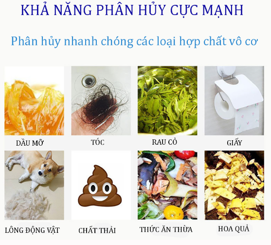 - Sản Phẩm Là Dạng Bột Phân Hủy Rất Mạnh Các Chất Như : Tóc ,Phân,Chất Cặn Bã ,Dầu Mỡ,Rau Củ, …