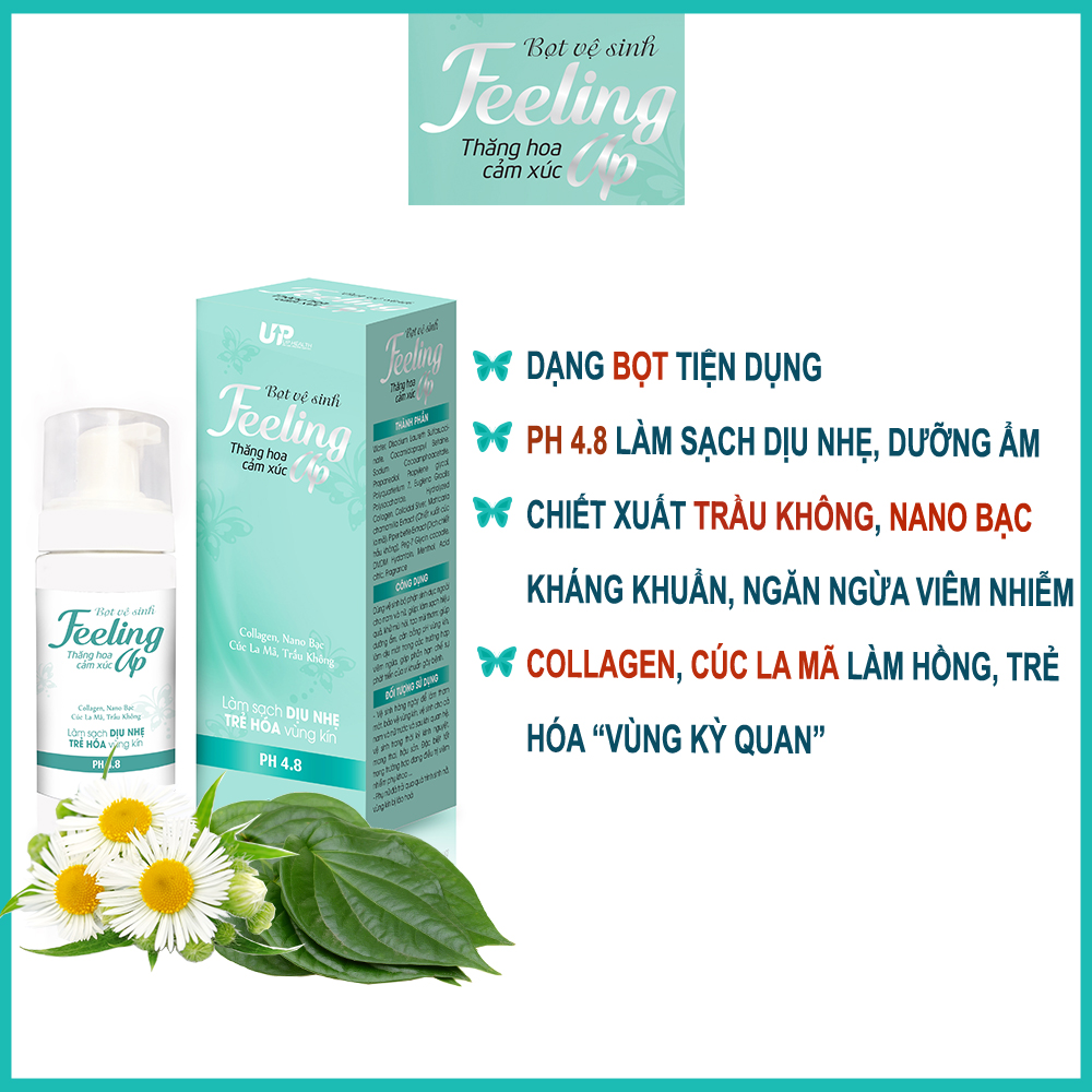 Với các thành phần Trầu không, Nano bạc, Cúc La Mã, Collagen,… Bọt vệ sinh Feeling Up giúp kháng khuẩn, làm sạch vùng kín một cách nhẹ nhàng. Hơn thế nữa, sản phẩm còn giúp nuôi dưỡng, trẻ hóa giúp “cô bé” sáng hồng, mềm mịn.