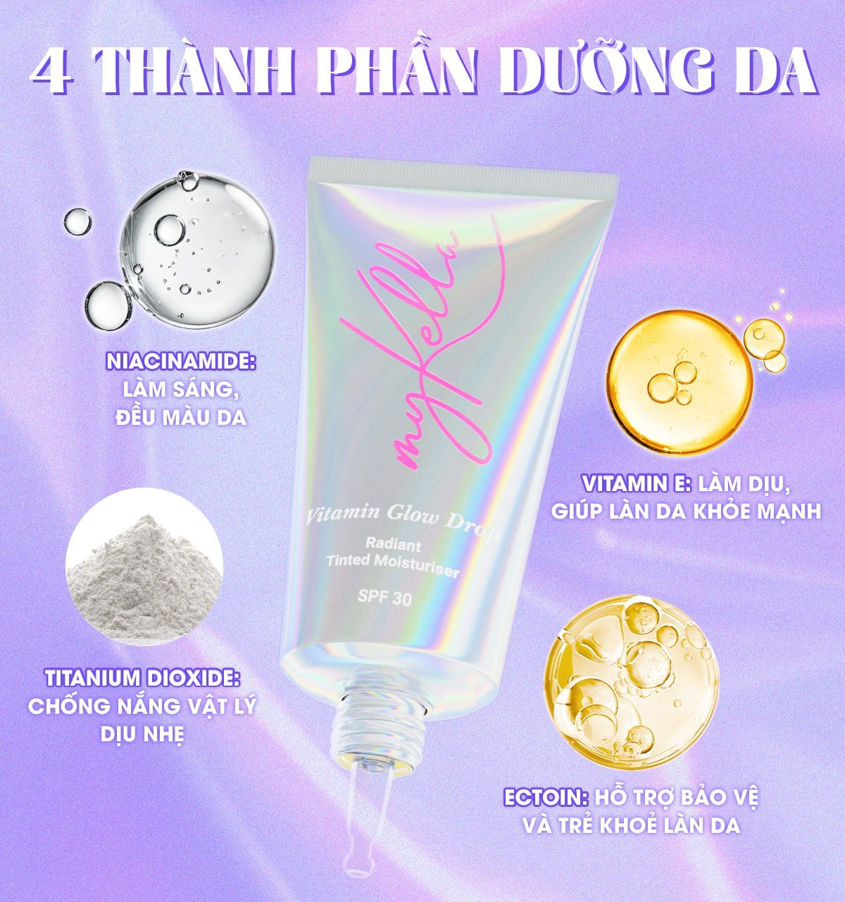 - Dưỡng ẩm sâu & giúp cải thiện độ sáng của da: Công thức chứa Vitamin E, Niacinamide và Ectoin giúp nuôi dưỡng làn da từ bên trong, mang lại hiệu ứng da căng bóng, rạng rỡ và đều màu.