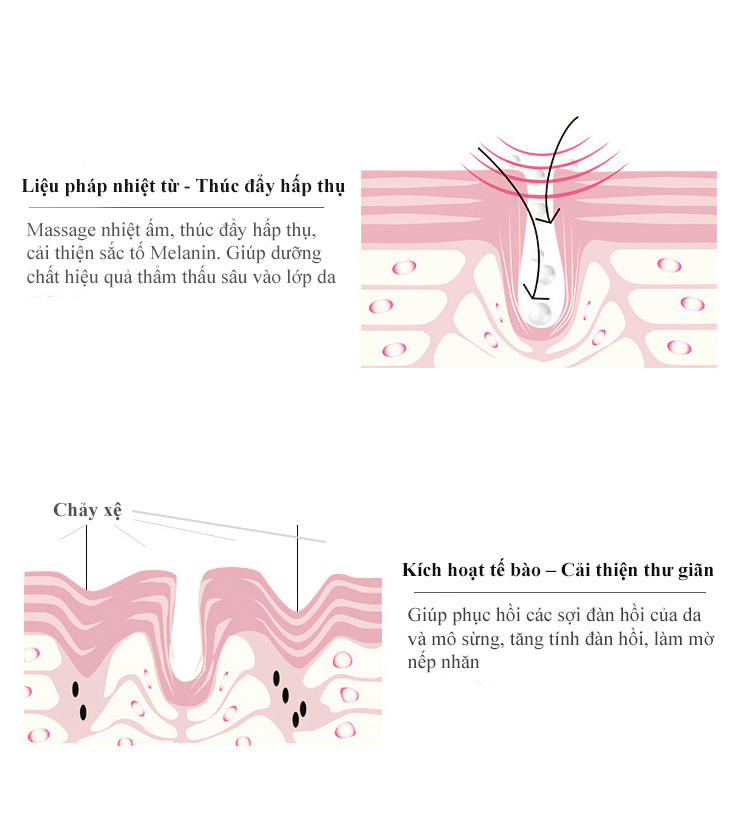 Kết hợp nóng và lạnh kích thích lưu thông máu lớp da bên dưới, sản sinh tế bào mới, giảm mỏi cho các tễ bào, qua đó tăng cường độ bóng và trắng sáng da, giúp làn da trở nên căng mịn hơn