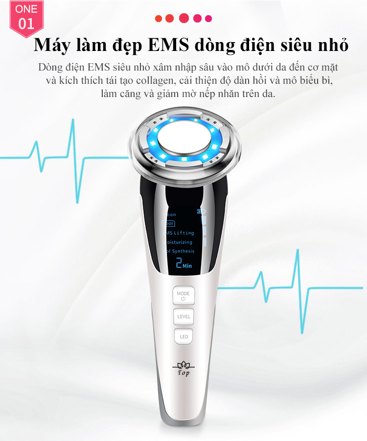 EMS được sử dụng dòng điện siêu nhỏ để kích hoạt tế bào da, kích thích tái tạo collagen, cải thiện độ đàn hồi của da, làm mềm nếp nhăn và cho làn da mịn màng và khỏe mạnh