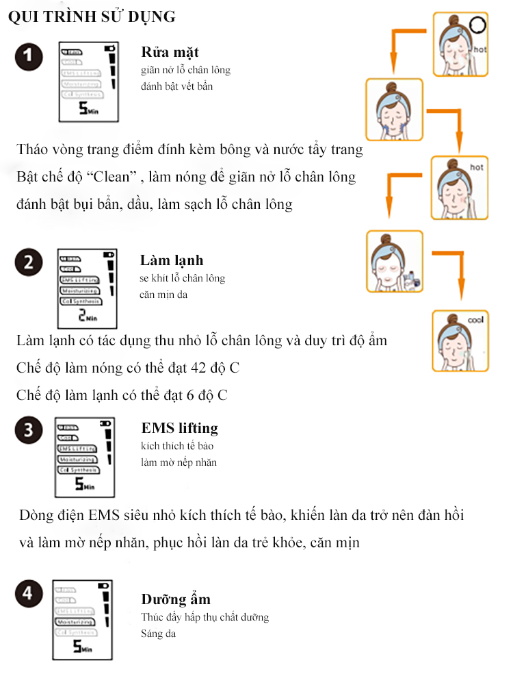 Theo nghiên cứu giáo sư Đại Học Nhật Bản, thường xuyên làm lạnh da ở nhiệt độ 42 ºC, hỗ trợ sản sinh protein HSP, phục hồi tế bào da và tăng cường độ đàn hồi cho da, qua đó hạn chế hình thành nếp nhăn. Làm nóng ấm da giúp giãn nở lỗ chân lông, thuận tiện cho việc làm sạch sâu. Mặt khác, làm lạnh da (6 ºC) se khít lỗ chân lông, khóa giữ chất dưỡng.
