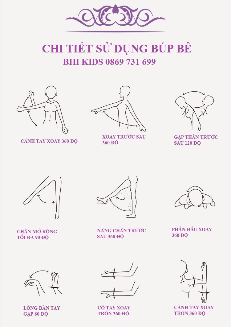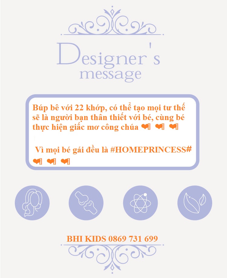 - Chất liệu: tóc sợi nhựa, cơ thể silicon, thân thiện môi trường.