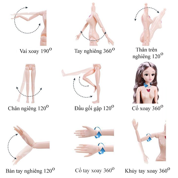 - Búp bê có khớp. Đầu, cánh tay, vai, đầu gối, cổ tay, cổ chân và các khớp khác có thể xoay được. 23 khớp xoay đảm nhận nhiều tư thế khác nhau, giúp búp bê trông giống thật và thú vị hơn.